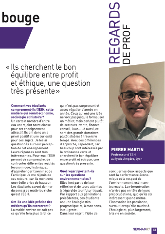 Un certain nombre d’entre eux ont rejoint notre classe pour cet enseignement attractif. Ils ont donc un a priori positif et une curiosité pour ces sujets. Je les ai questionnés sur leur percep- tion de cet enseignement. Leurs réponses sont très intéressantes. Pour eux, l’ESH permet de comprendre, de confronter différentes réalités (économique, historique), d’appréhender l’avenir et de l’anticiper. Je me réjouis de ces retours, car ils montrent une réelle prise de hauteur. Les étudiants savent donner du sens à ce matériau riche qu’est l’ESH.